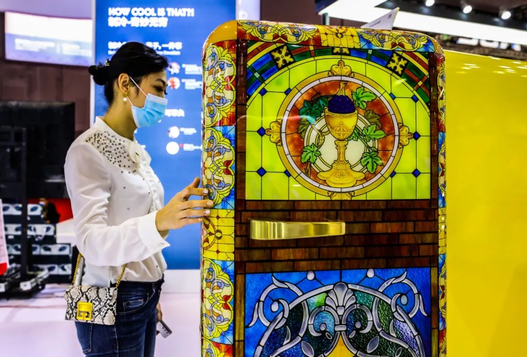 2021年11月8日在第四届进博会消费品展区内,高颜值复古HCK哈士奇冰箱,突破了人们对冰箱色彩单一的固有思维,吸引观者目光
