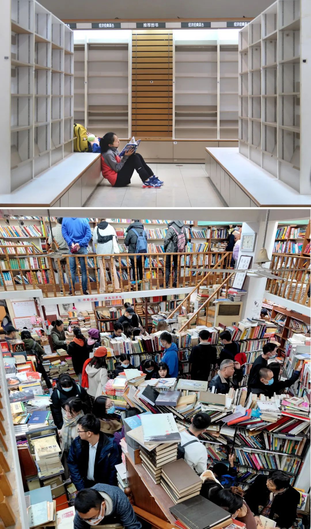 2021年12月12日(上图)上海书城迎来装修前的最后一个营业日,也是上海书城23岁“生日”。在这个特殊的日子,不少读者特意再来书城逛一逛,重温美好的阅读记忆;(下图)同日,为配合区域整改规划,营业20余年的复旦旧书店正式停业,读者纷纷前来告别