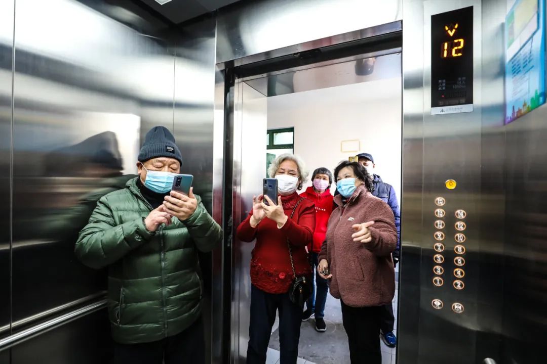 2021年12月21日黄浦区五里桥街道达新大楼的老旧电梯经过“三会”制度的助力,旧貌换新颜