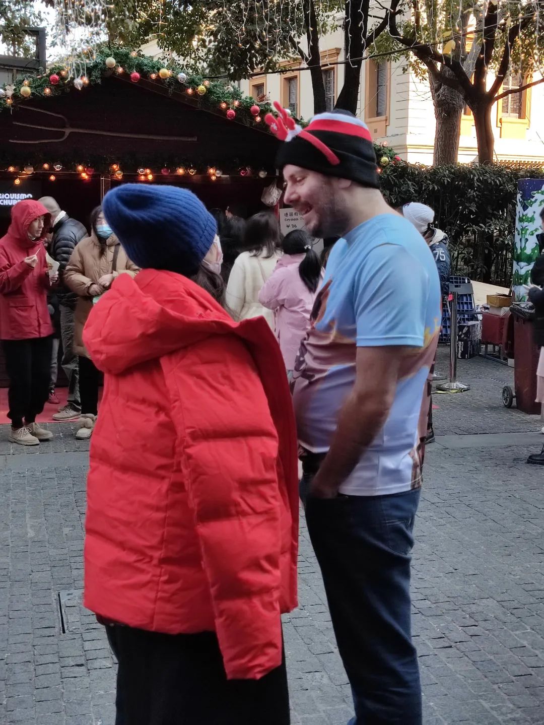 2021年12月25日在圆明园路参加圣诞集市的两位游客衣着形成鲜明对比