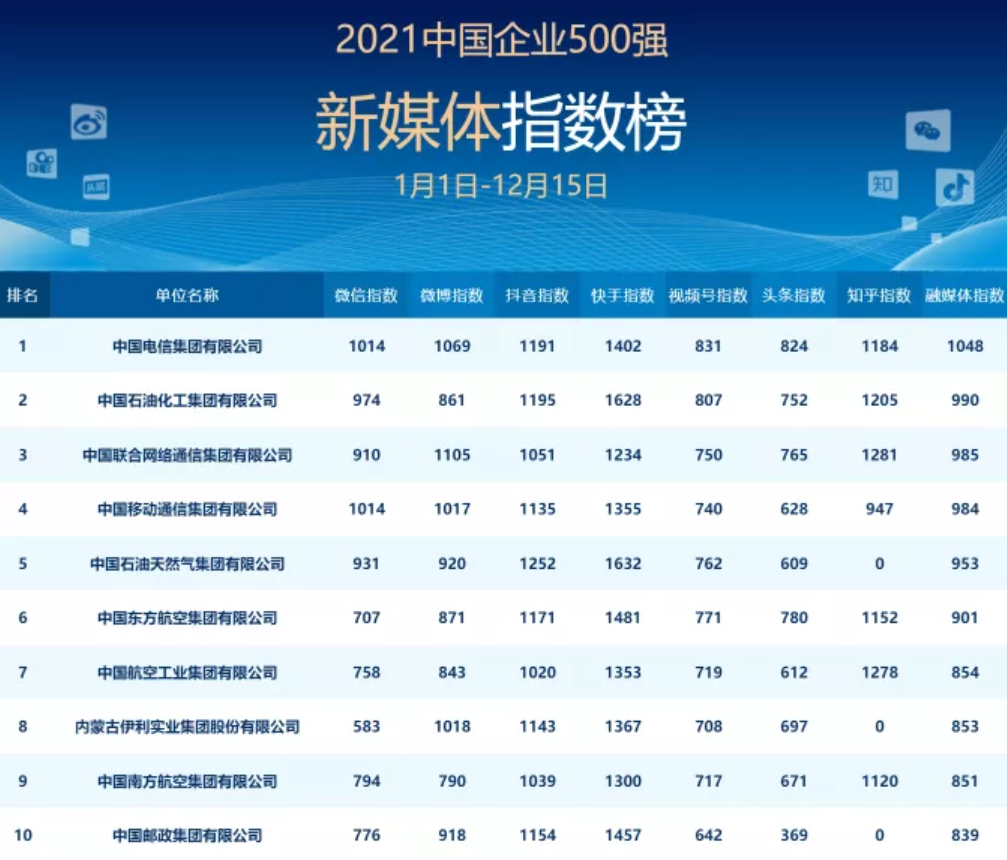 (2021年度中国企业500强新媒体指数榜 部分截图)