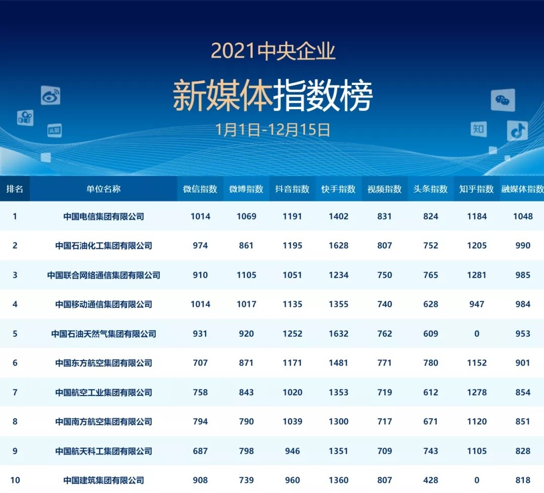 12月31日,国务院国资委新闻中心公布了2021年度“中国企业新媒体指数榜”和“中央企业新媒体指数榜”,中国电信在两个榜单中均位列第一。这是中国电信在今年连续12个月排名两个榜单月榜第一之后,获得的年度第一荣誉。