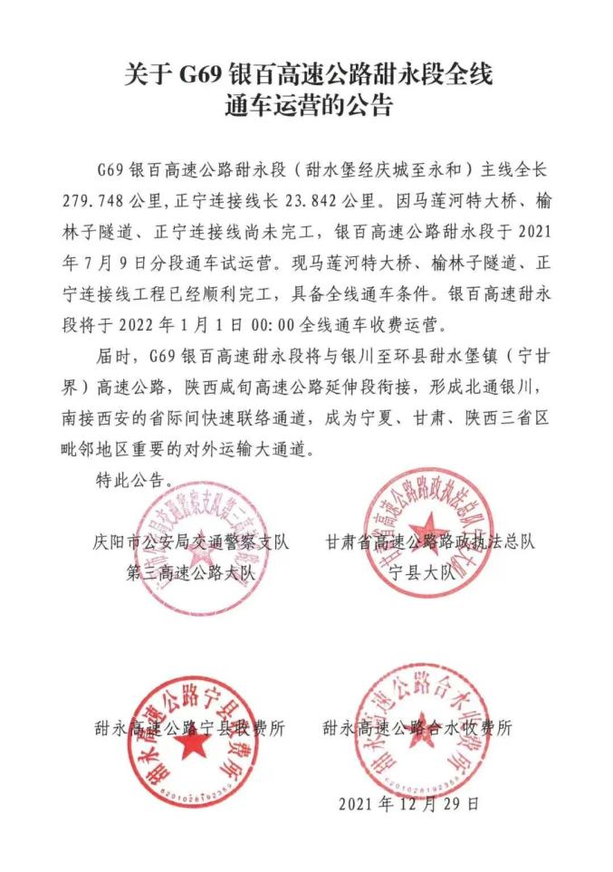 关于G69银百高速公路甜永段全线通车运营的公告