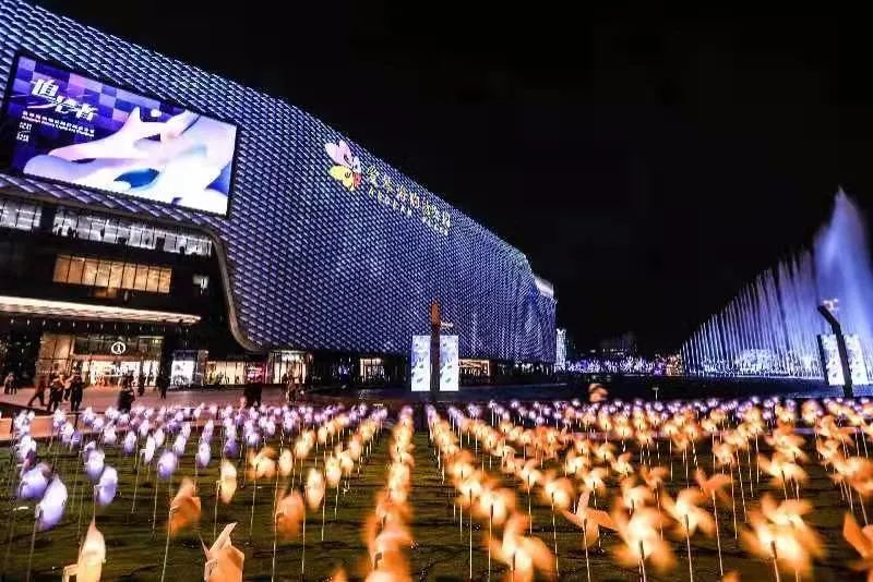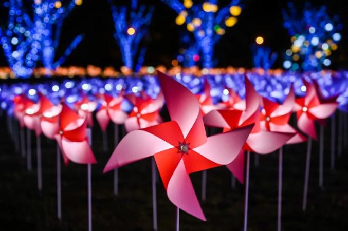 近14000个色彩缤纷的风车均匀排布商场周围,随风转动,熠熠生辉如群星闪耀,营造出一片色彩纷呈的光之梦境。占地面积近10000平方米的灯光风车海,与两大主题艺术装置作品遥相呼应,以光承载希望,启迪公众对光明未来和美好生活的无限憧憬。