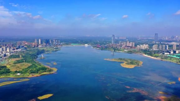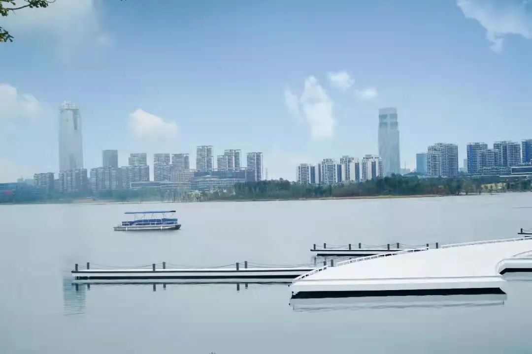 站在桥上,既可以拍到兴隆湖如海平面一般的波澜壮阔,又可以眺望总部商务区与科学城。