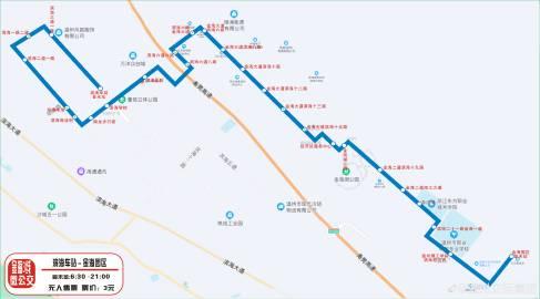 由滨海车站首末站始发,途经滨海三道、滨海一路、滨海二道、滨海六路、海桐路、滨海八路、滨海六道、滨海六路、金海大道、滨海十五路、金海一道、滨海十七路、金海二道、滨海二十一路、金海一道、滨海二十五路,至金海园区首末站(往返)。运营模式:线路按定线、不定点(即在固定的线路走向上,确保安全的前提下,招手上车、固定站点下车)的运营模式开行。