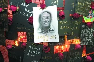 北京798时代空间画廊,人群蜂拥而至,没有花圈与眼泪,没有挽联与告别,只有祝福与怀念。60根红烛绕成一圈,一张张方正的卡片上各附有一朵红色玫瑰,热烈而悲壮。