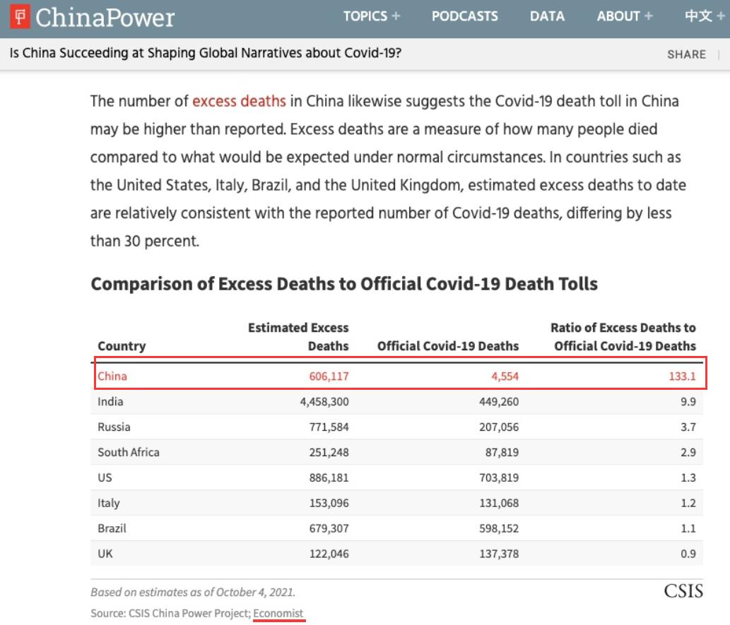 原来,去年11月初,美国鹰派智库“美国战略与国际问题研究中心”(CSIS)就曾在一篇攻击中国防疫成果的文章中引用过《经济学人》的这个模型,称中国的疫情“实际死亡人数”为60万人,是官方通报的4000多人的130多倍,想以此妖魔化中国严格的限制性防疫措施,给西方的“佛系”防疫政策辩解和开脱。