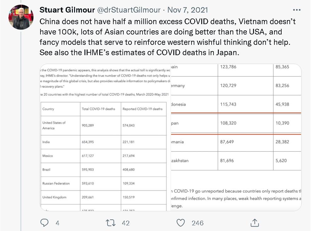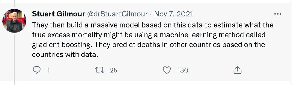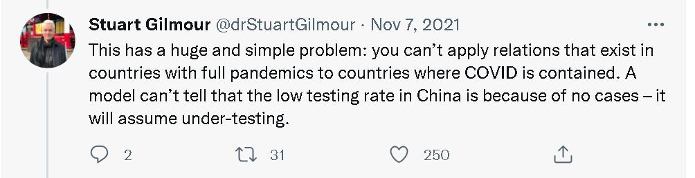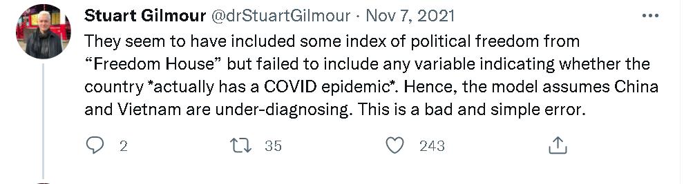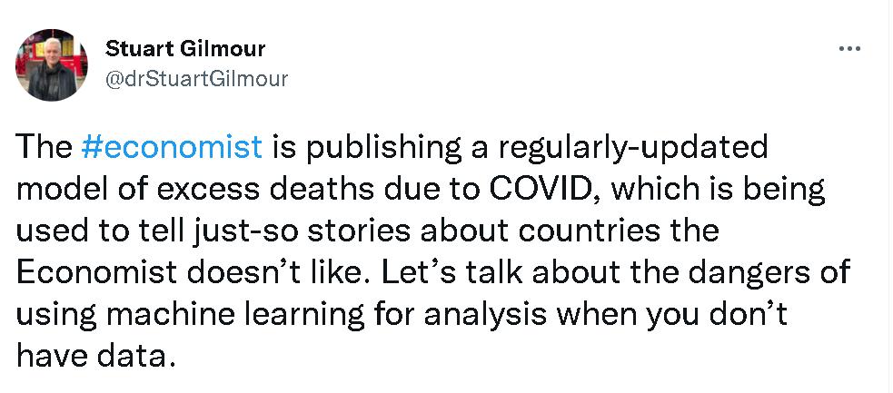 但一些认真做学问的西方专家就当时发现,《经济学人》的这个模型存在许多问题。其中,日本圣路加国际大学(St. Luke's International University, Japan)的生物统计学教授Stuart Gilmour就连发了20多个贴文,详细指出了《经济学人》这个新冠疫情“实际死亡人数”的大数据模型和人工智能推算系统在推算中国和越南等采取严格防疫措施的亚洲国家时存在的严重误差以及这种误差的由来。