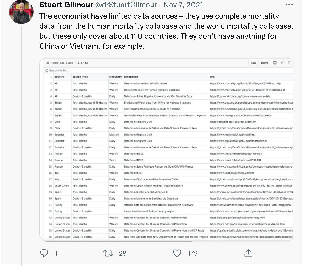 (截图来自美国斯蒂文斯理工学院教授George Calhoun的“火星文”)可极为尴尬的是,《经济学人》杂志虽然确实搞了一个大数据模型,并通过“人工智能”推算了一番世界各国新冠疫情的“实际死亡人数”,但其搜集和使用数据这些数据的方式方法却存在着多处严重的漏洞,而且早在11月就已经被西方的专家自己揭露过一次。