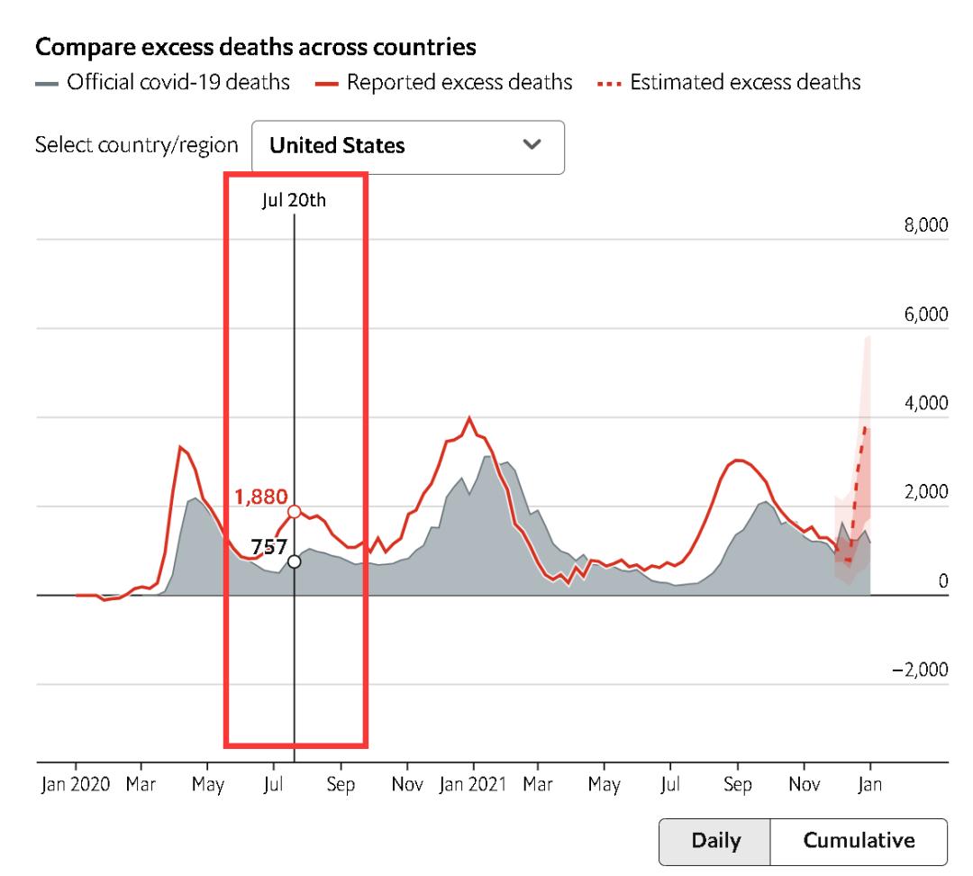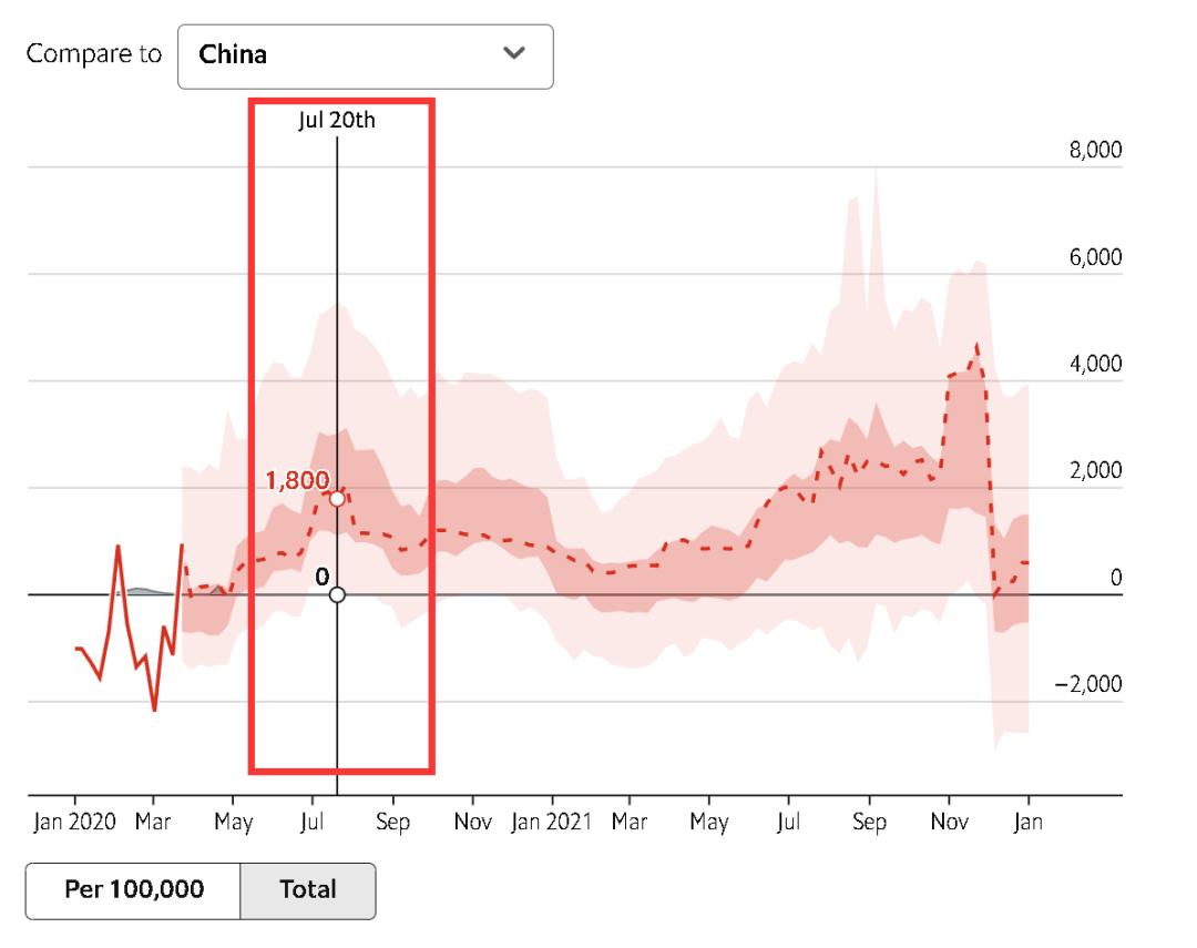 这便是为何,在比如2020年7月20日这天,虽然当时中国的疫情早已得到有效控制,当天只是新增了11个确诊病例(8例本土,3例境外输入)和6例无症状感染者,且无人死于新冠,可《经济学人》的大数据模型和人工智能系统却离奇地“推算”出了中国在当天因疫情死了1800人。因为,《经济学人》认为当天美国的“实际死亡人数”应该在1880人(当天美国通报的死亡人数为757人)。