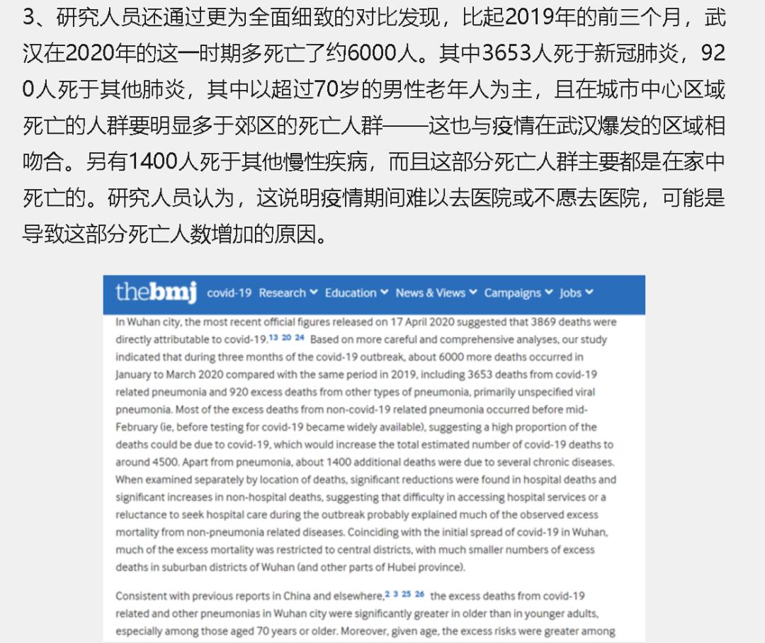 根据那篇论文的分析,比起2019年的前三个月,武汉在2020年前三月新冠疫情爆发时期,总共多死亡了约6000人,其中有3653人死于新冠肺炎,还有920人死于其他肺炎,另有1400人死于其他慢性疾病,这可能是因为当时医疗资源被挤兑,或是患这些其他病症的人不愿再去医院所致。
