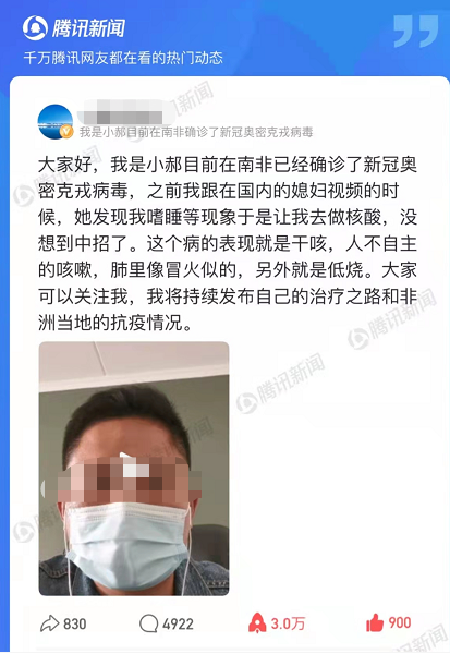 2021年12月3日,红星新闻曾报道因公派驻南非的中国人郝先生感染奥密克戎毒株,成为首个被披露感染了此毒株的华人一事。