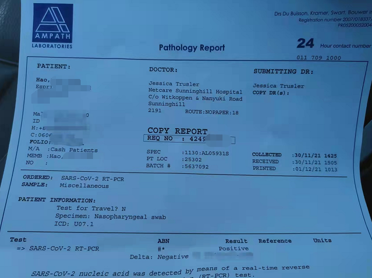 红星新闻此前曾报道,郝先生去年11月29日感觉到头痛、嗜睡等身体不适症状,次日南非当地医院的核酸检测结果显示,确诊感染奥密克戎毒株。
