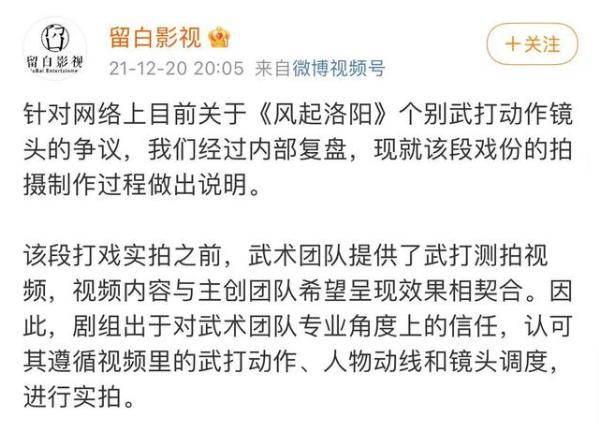 争议之下,出品方发博做出回应。/微博还算及时且诚恳的回应过后,围绕《风起洛阳》的舆论风波总算暂时平息下来,但纵观这些年国产古装剧受到的种种批评,如果要总结几个频率最高的关键词,那么“武打戏”一定排得上前几名。在抄袭之外,“太塑料”“太假”“太尬”“太随意”……古装剧里的武打戏几乎一直处在观众吐槽的风口浪尖。