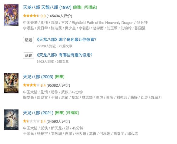 2021年再次翻拍的《天龙八部》被观众疯狂吐槽,豆瓣评分和前作对比鲜明。/豆瓣在这一段时间里,武侠剧贡献了大量的经典荧屏形象。彼时,黄日华和翁美玲塑造了郭靖黄蓉这对最经典的荧屏CP;焦恩俊在《小李飞刀》中顶着雷人的泡面头,但“李寻欢”依然以绝对实力与“平平无奇”的古天乐并称“南焦北古”;97版《天龙八部》引进内地后,一度在5个卫视电视台同时联播,创下了一系列播放纪录,试问当年,哪个80后90后的童年里没有那首周华健的《难念的经》呢?