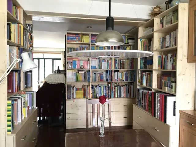 搬家前住在不到30平方的出租屋里,一房一厅,小小的客厅用简易书架做了个书墙。