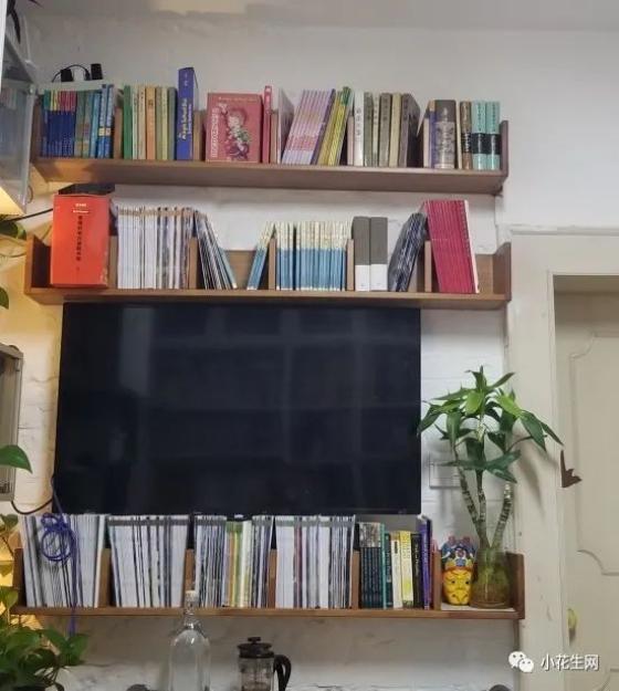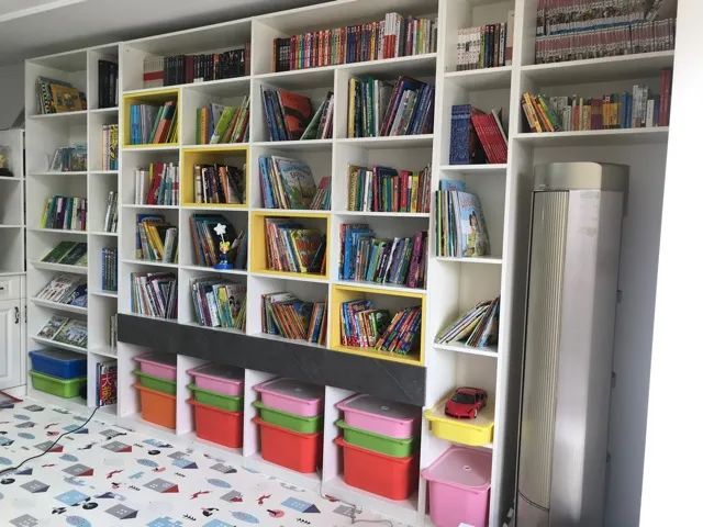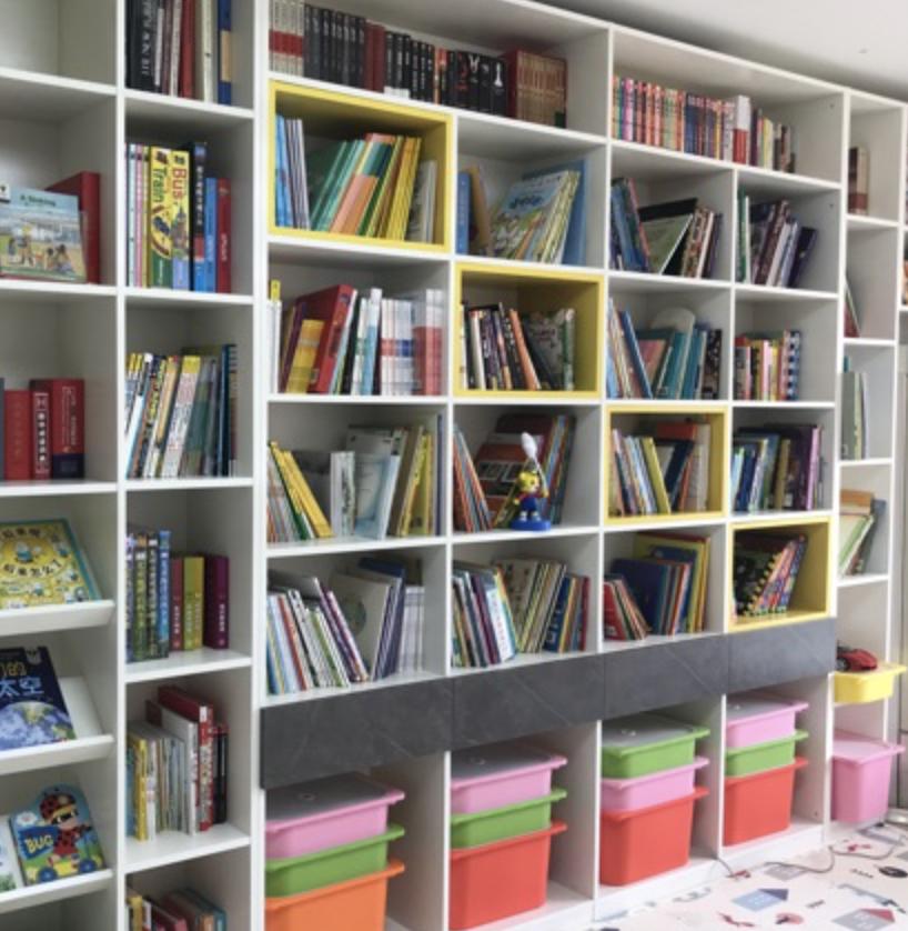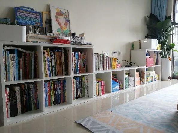 因为孩子对绘本特别的热爱,也想给他一个安静阅读的氛围,加之眼睛遗传基因并不好,终于“力排众议”把家里电视撤掉,换上书柜墙。书柜墙全部开放式,因为我家书房也是全开放,习惯了,连格子的高矮都是我一个一个量的、算的。