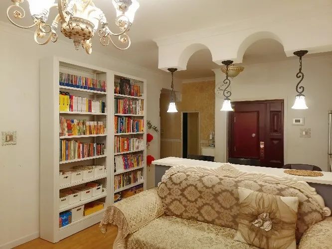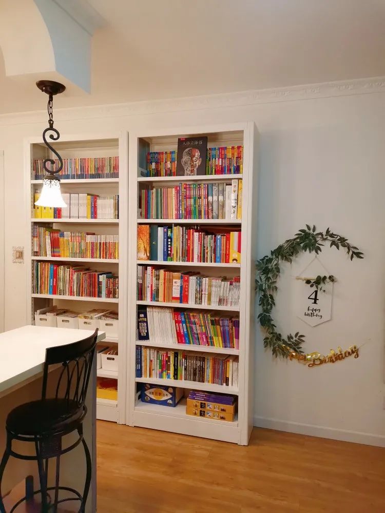 最近又购入两组图书馆书架,均为2.4米层高,考虑到家里装修主色调都为象牙白,所以书架颜色也购入了同色系的珍珠白!这次还是将书架放置在客厅靠近吧台以及沙发旁的位置,这样全家拿取图书阅读都非常方便。