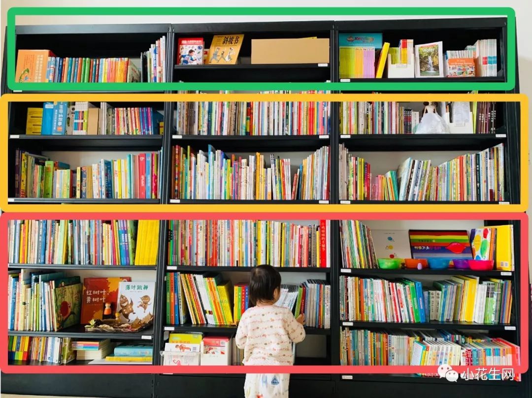 根据孩子和我的身高,我将家中的书柜分为三个区域:红色是孩子方便的区域,黄色是大人方便的区域,绿色是大人孩子都不方面拿取的区域以上问题都考虑清楚后则是书和收纳空间的匹配,把你最喜欢、最想要阅读者接触的分类放在最方便取阅、视线最佳的位置,最不方便的位置则放置一些囤货、待处理、闲置等书籍。
