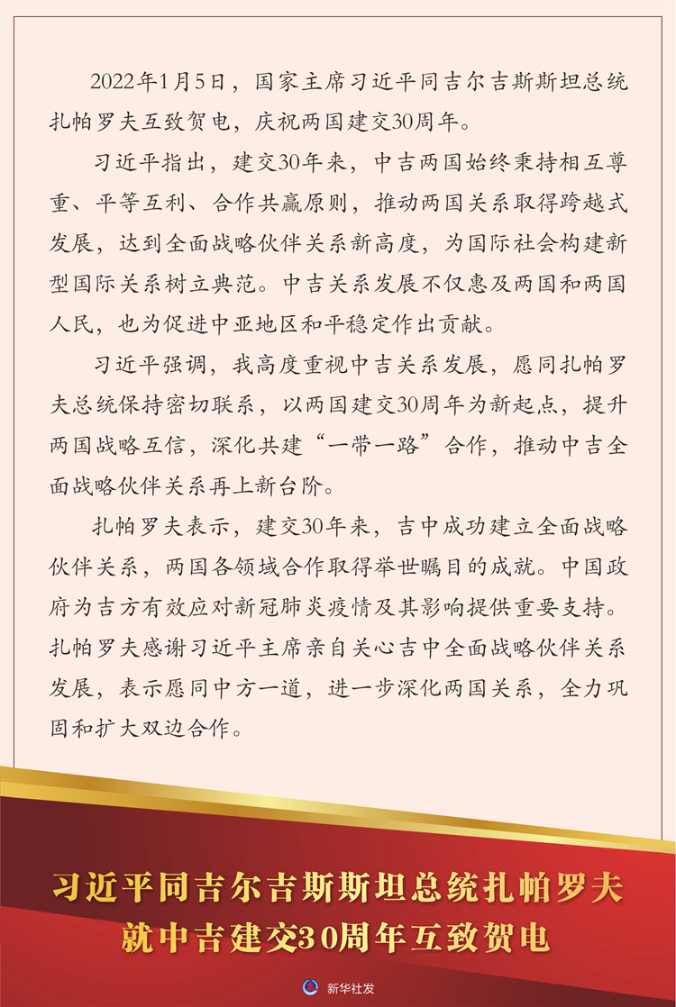 2022年1月5日,国家主席习近平同吉尔吉斯斯坦总统扎帕罗夫互致贺电,庆祝两国建交30周年。