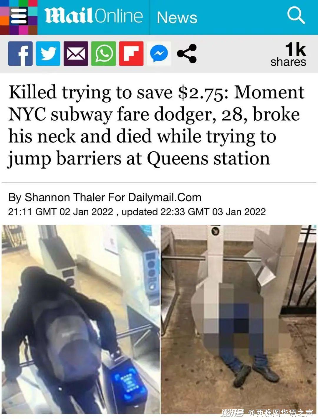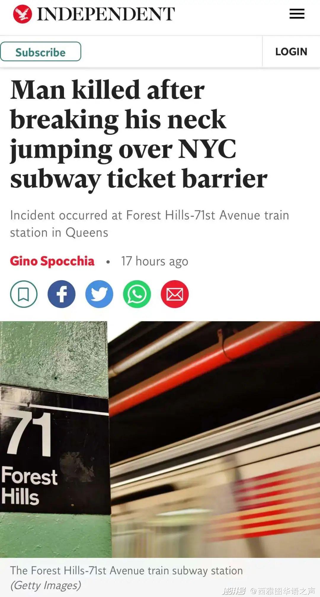 8、纽约男子为逃地铁票多次尝试跳过闸机,结果摔断脖子当场死亡