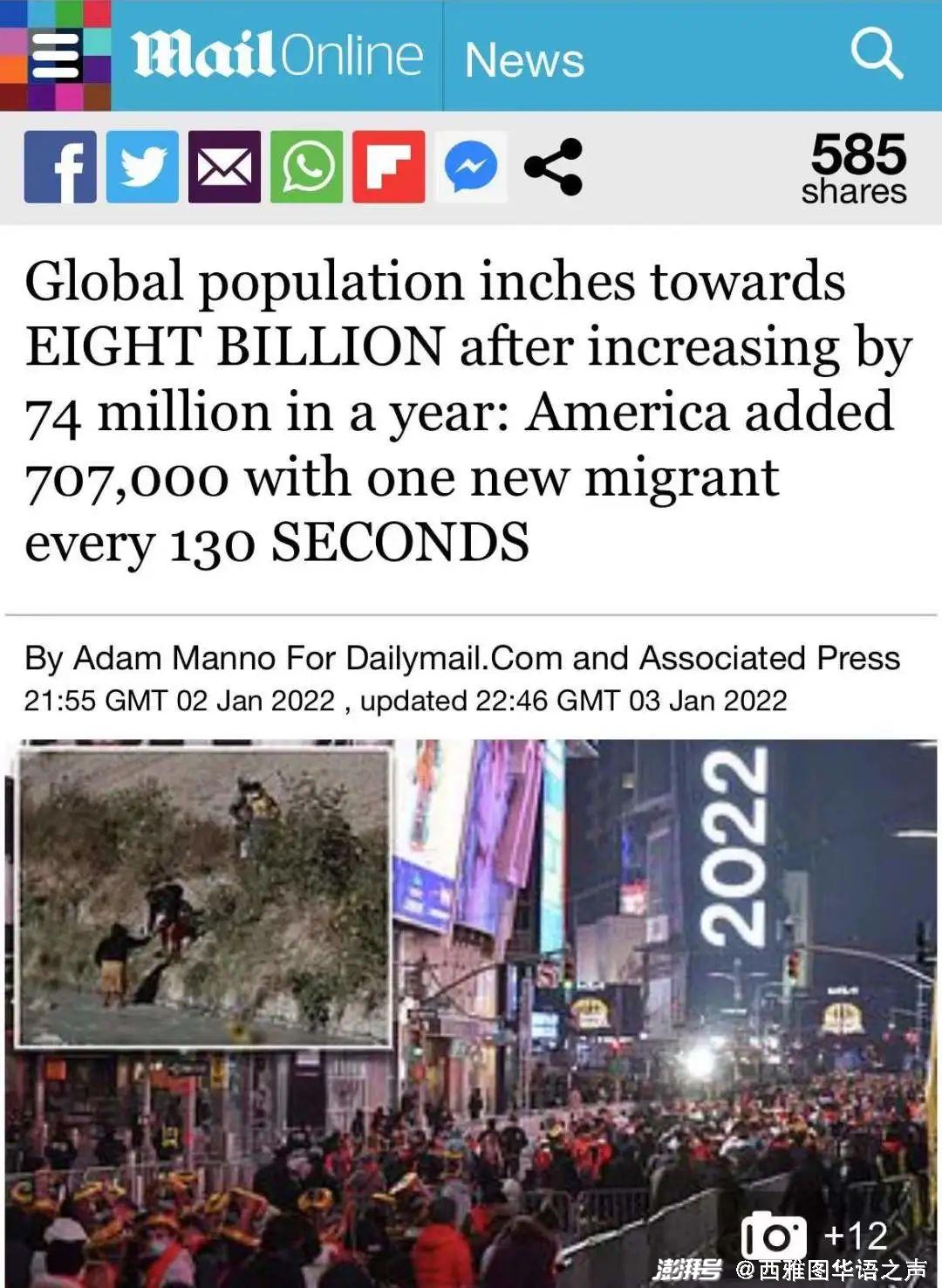 【综合讯】根据美国人口普查局提供的资料,在2022年1月1日元旦,预测全球人口高达78亿,比2021年元旦增加了7400万人,增幅为0.9%。而由新的一年开始,全球平均每秒有4.3人出生、2人死亡。