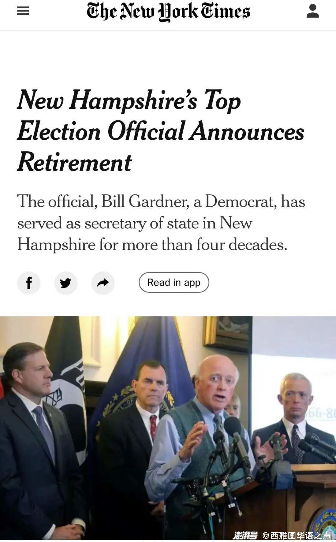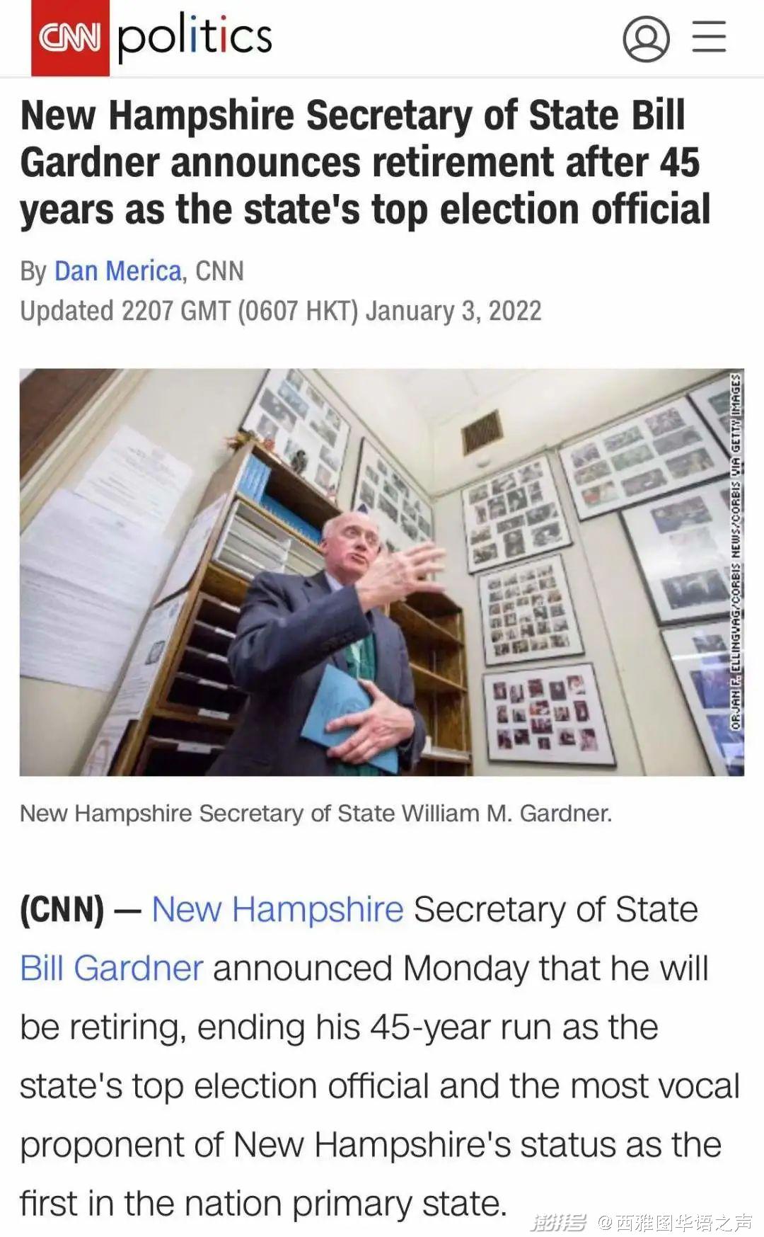 【美联社】据报道,新罕布夏州务卿加德纳(Bill Gardner)3日宣布退休,理由无关健康、无关政治,只是想在选举周期中,「最顺」的时间点离职。当年眼见好友入伍当兵,在越南战死,誓言把投票年龄降为18岁而踏入政坛,1972年首度竞选州议员,1976年当选后,到2020年第23度当选的加德纳,是全美任州务卿最久,也是保持第一个总统初选州中立客观名声功劳匪浅的政治人物。