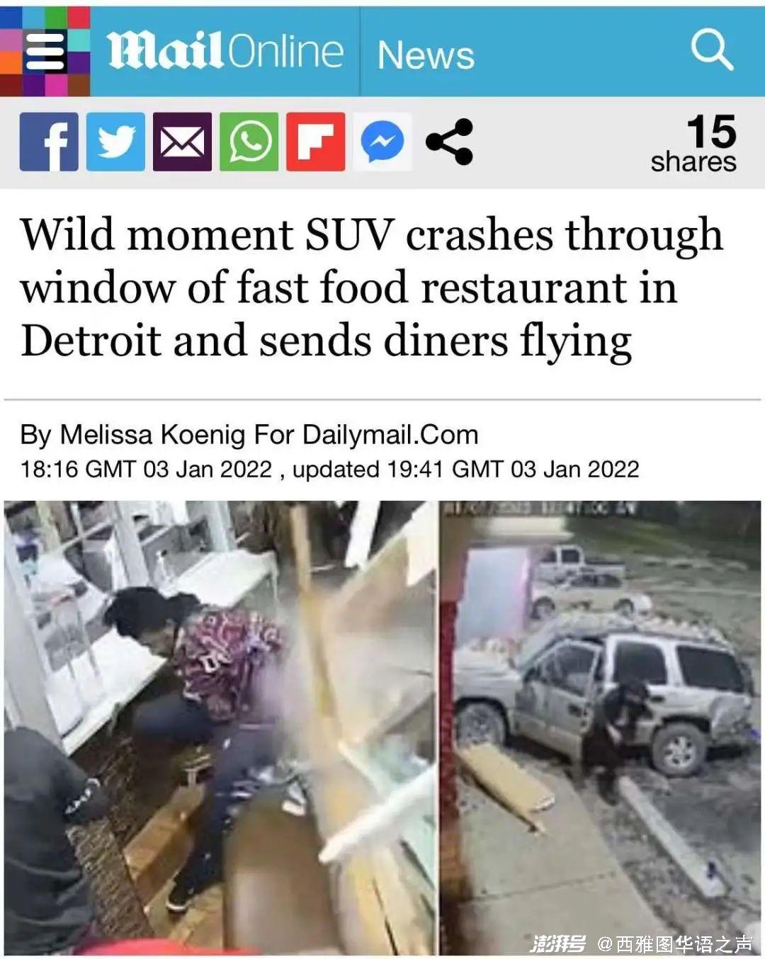 据《每日邮报》1月3日报道,美国底特律一辆汽车1日冲入一家快餐店,店内多名顾客奇迹般躲开撞击,无人受伤。