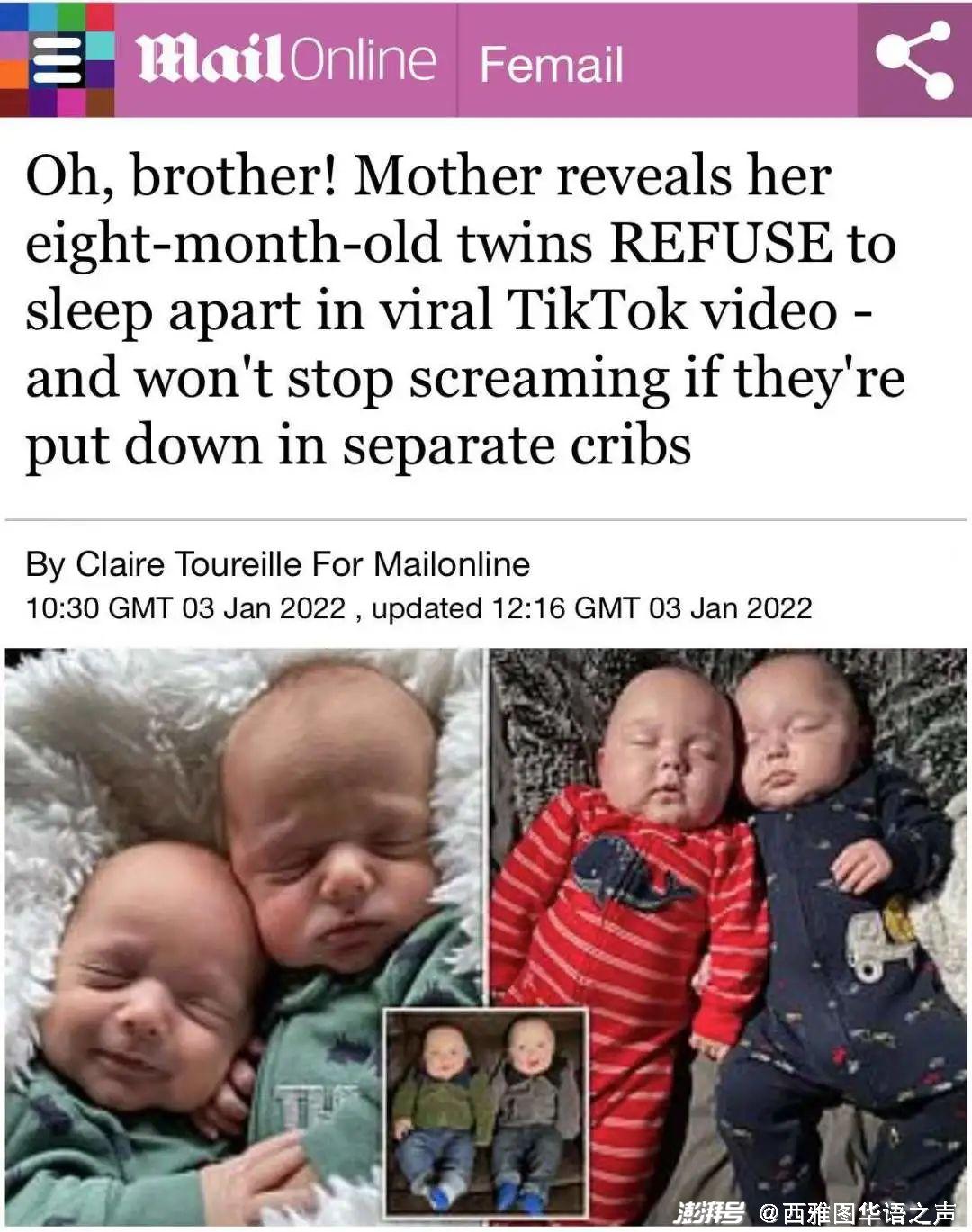据《每日邮报》1月3日报道,美国明尼苏达州一对8个月大的双胞胎兄弟因不愿意分开睡觉而哭闹,可爱的画面在网上走红。