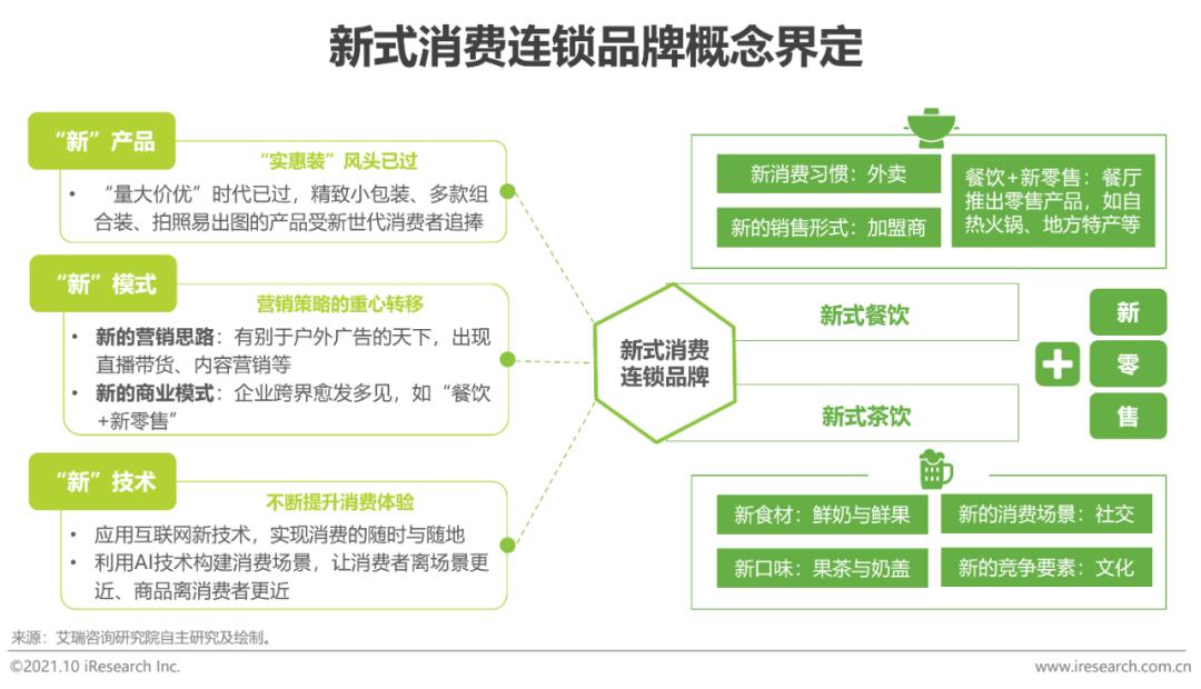 “新式茶饮”脱胎于现制饮品,是从现场制作、销售、交付,到产品、品牌和顾客体验全方位的新升级,主要可从三方面进行界定:1)产品形式更新颖,即应用新的加工技术,创造出有创新力的产品。新茶饮通常指以优质茶叶为基底,加入鲜奶、鲜果等优质食材,通过多样化的茶底与配料组合而成的饮品,取代了过往色素+植脂末粉剂冲泡的形式,更关注茶饮产品的口味、多样性和风味的保留,成为更加百搭的中国式饮品。2)品牌文化更具新意,衍生出众多周边产品,并积极与国潮品牌跨界联名。3)顾客体验更新潮,门店装修具有设计感,往往设置休闲/社交空间;通过App/小程序等多元化点单模式,创造新的购物体验。