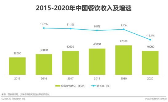 受2020年初疫情影响,2015-2019年餐饮行业的收入增长趋势被打断,线下消费形式受到较大的冲击,全国餐饮业收入水平有明显的下降,但线上消费形式所受影响相对较小。由中国外卖收入数据可知,2015年起餐饮行业信息在线化、交易在线化和行为在线化等趋势显现,尽管近两年增速放缓,但整体仍然保持上升趋势,可以预见其对国民经济的带动作用将逐渐增强,未来势必会成为餐饮行业发展的有力增长点。
