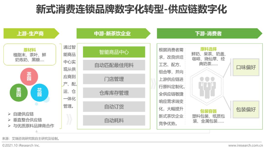 一体化管理产配运仓,根据消费需求向上游逆向定制以新式茶饮行业为例,从原材料采购订货到配送、仓储,再到奶茶制作、门店管理,最后将产品提供给下游消费者,整体产业链较长,上游原料多样化且供应商较为分散,对供应链数字化产品需求迫切。市场上部分新茶饮企业意识到供应链数字化工具的重要性,已着手部署,如喜茶自建供应链系统,奈雪的茶通过智能商品管理中心为门店配送最佳原料,在一体化管理的基础上实现自动订货、自动耗料等功能。而产、配、运、仓的数字化,也为数据的自动采集和分析提供支撑,下游消费者的偏好变化也可以在数字化的基础上传导至上游原材料进行“反向”定制,实现采集、分析、决策的闭环链路。