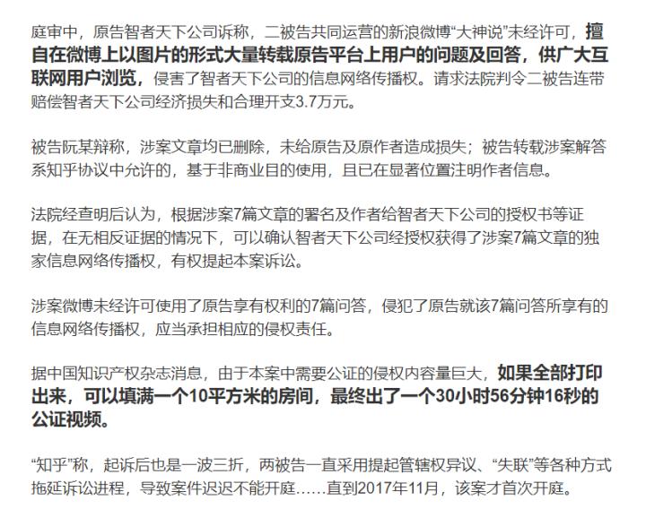 “大神说”这样,长期搬运知乎内容的营销号,先是管辖权异议,又是失联,一路拖延,最后硬是从2016年折腾到2017年11月,才首次开庭。而在如此漫长的诉讼,并提交了大量的证明材料后,赔偿所得是多少呢?