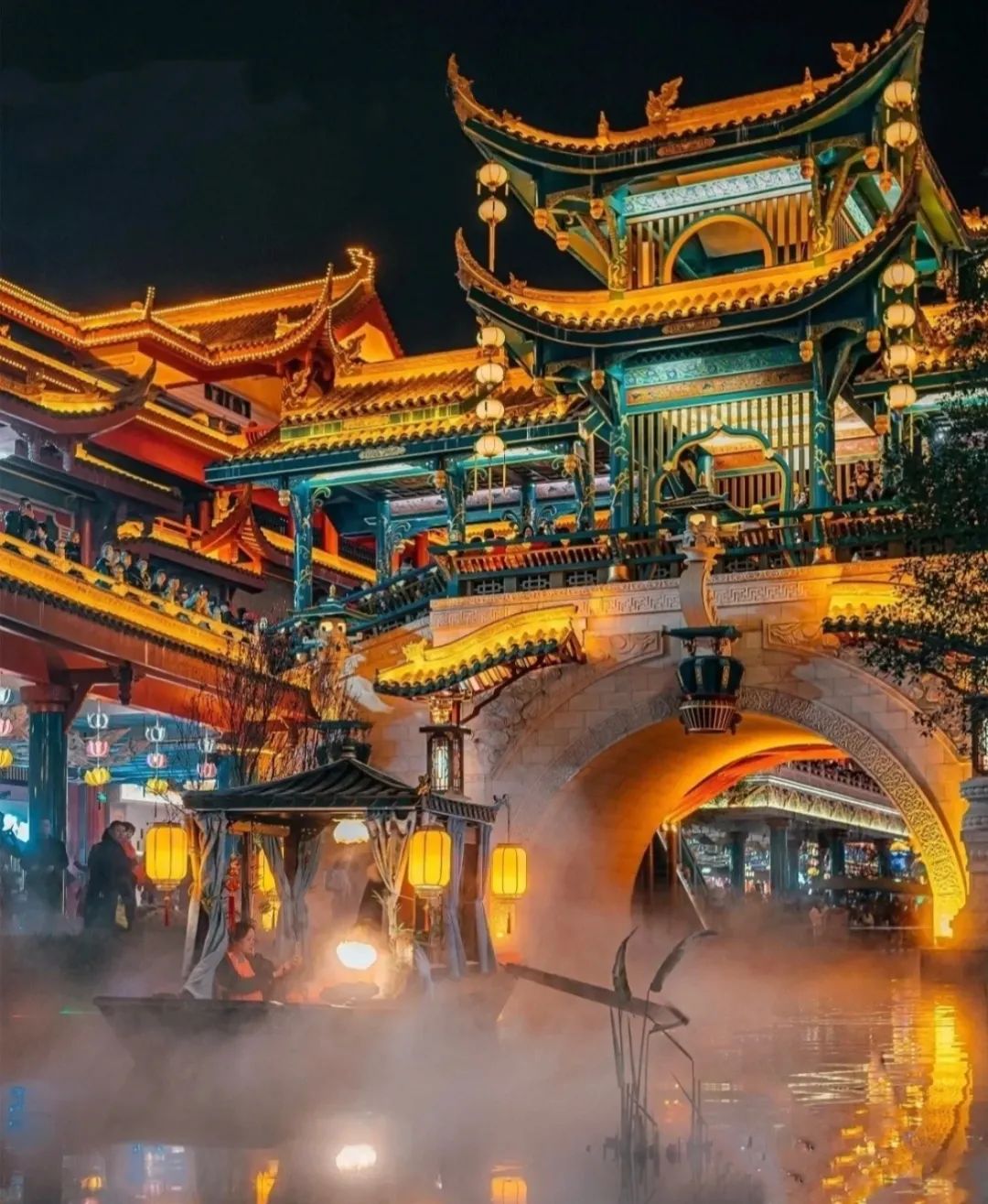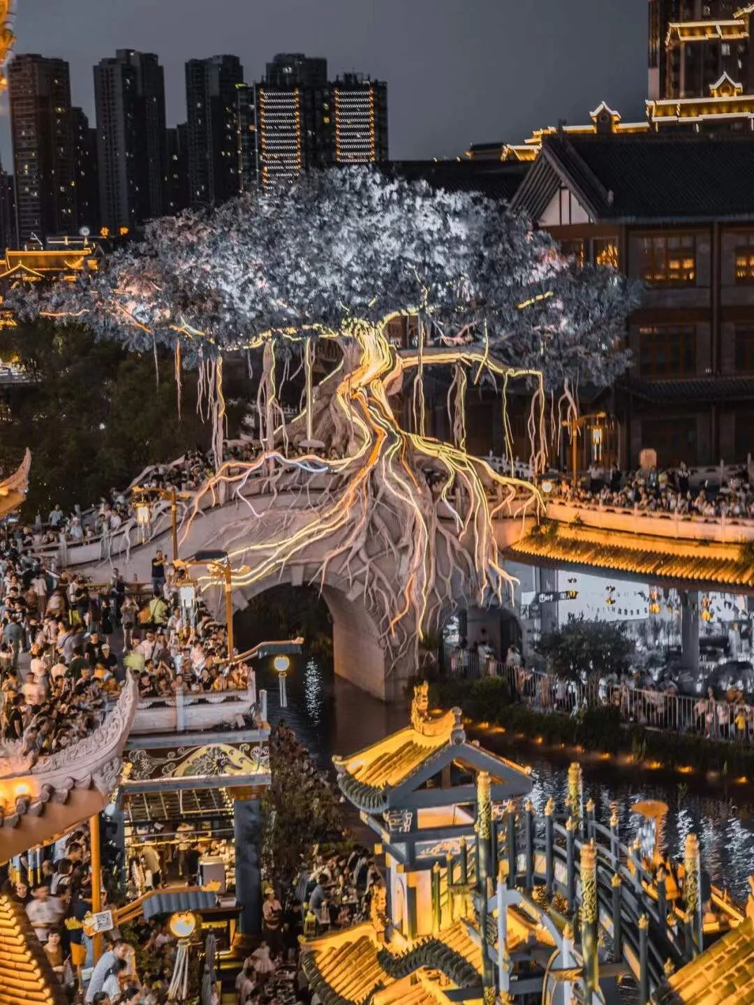 每当夜幕降临,红墙青瓦的古风建筑群灯火四起。河灯、神树、画舫、桥廊、亭台楼榭间处处灯火辉煌,仿若瑶池天街。