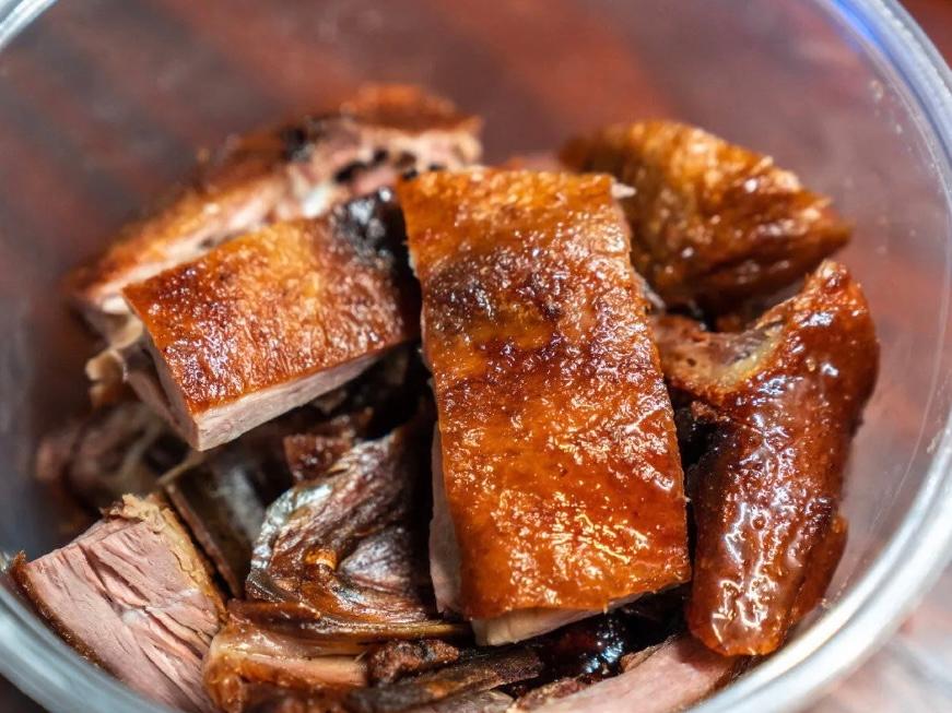 点一整只鸭子尝尝,精髓在于那淋上糖油的鸭皮。鸭皮疙瘩如同闪烁的琥珀流光,肌肉断面晕染着诱人色泽。