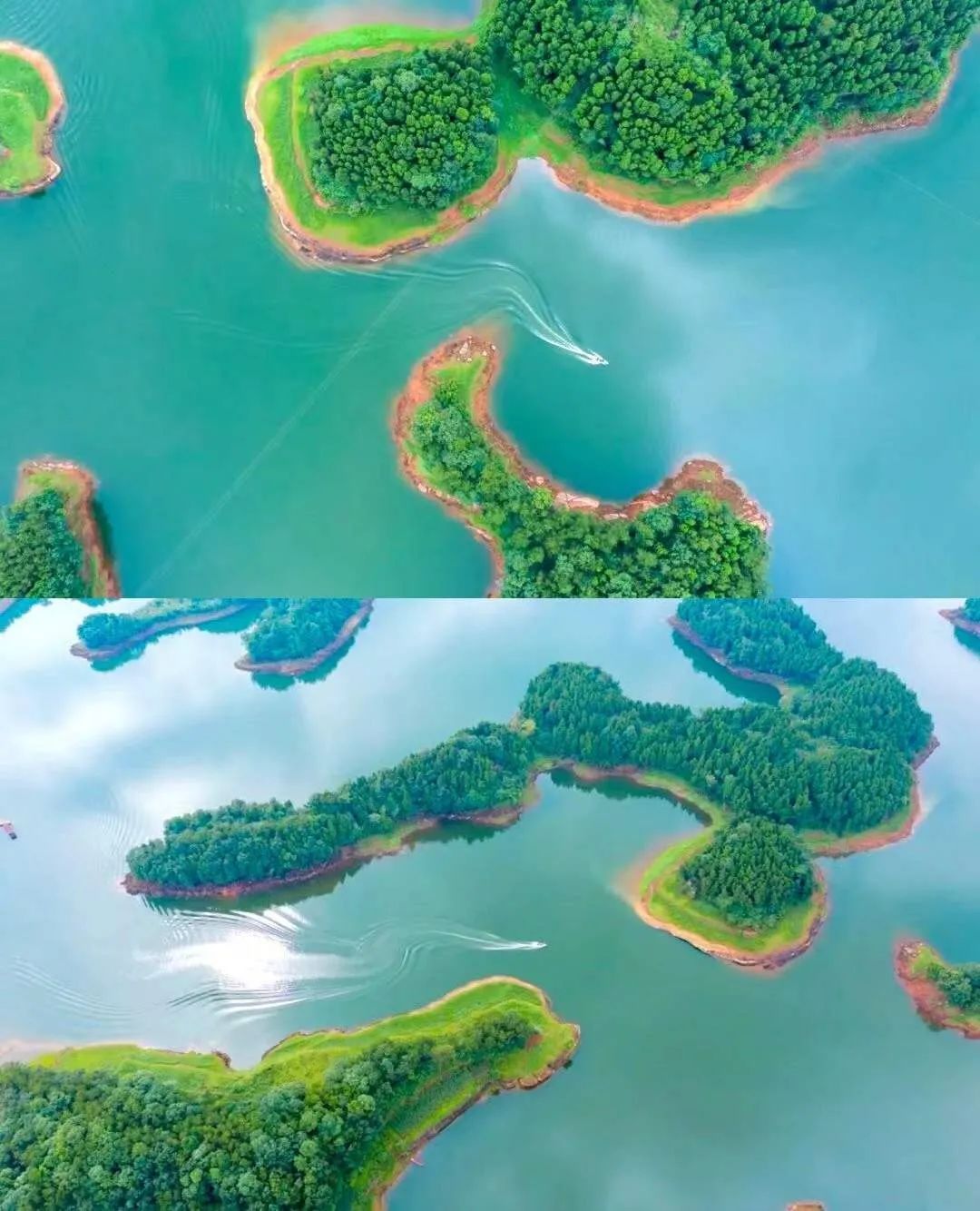 72座环绕的群岛有了烟雾缭绕的青山加持,像是加了滤镜般美好动人。时时传来几声悠扬的鸟鸣声,如梦似幻,静谧和美。