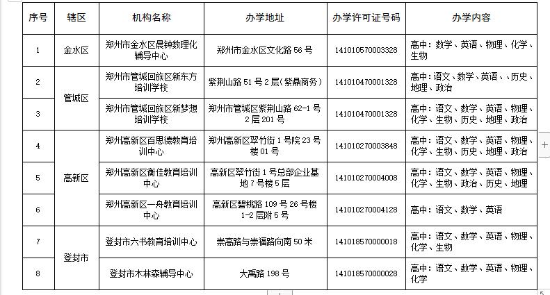 郑州市普通高中阶段学科类校外培训机构白名单(点击图片可查看大图)
