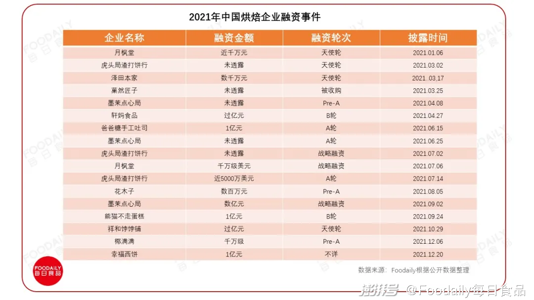 2021年,国内烘焙赛道投资事件近20起,墨茉点心局、虎头局、爸爸糖、幸福西饼、祥和饽饽铺纷纷拿下亿元级融资,可以看出,新烘焙俨然已经成为一个热门赛道。