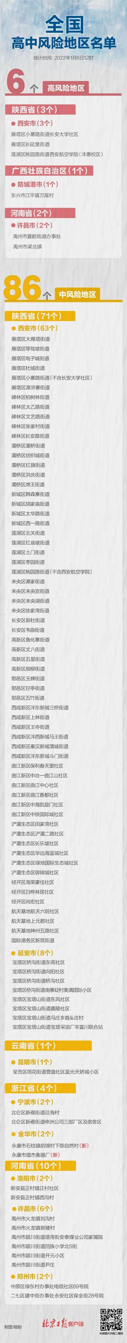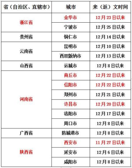 请金华市、商丘市、信阳市、郑州市、许昌市、宁波市、洛阳市、铜仁市、西双版纳自治州、昆明市、运城市、周口市、、咸阳市、防城港市、延安市、西安市等发生本土疫情地区的入(返)文人员,与已公布的阳性感染者活动时空轨迹重叠人员,到过或途经中高风险地区人员,请第一时间主动向所在社区(村)、住宿宾馆和单位报备,配合落实属地疫情防控指挥部管控措施和相应核酸检测要求。