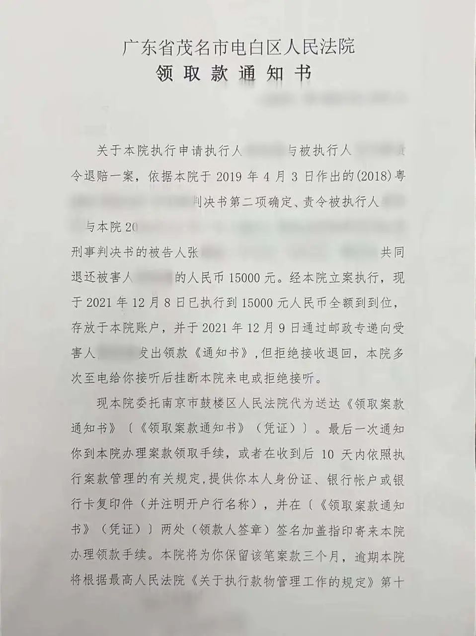 当地警方成功破获案件,经过法院审理并进入执行程序,历经重重困难,2021年12月,茂名市电白区法院终于执行到款项15000元,准备发还王大爷。电话通知老人办理领款事宜,王大爷一听对方是广东口音,不禁想起之前被骗的经历,没等对方说完就狠狠挂断电话。