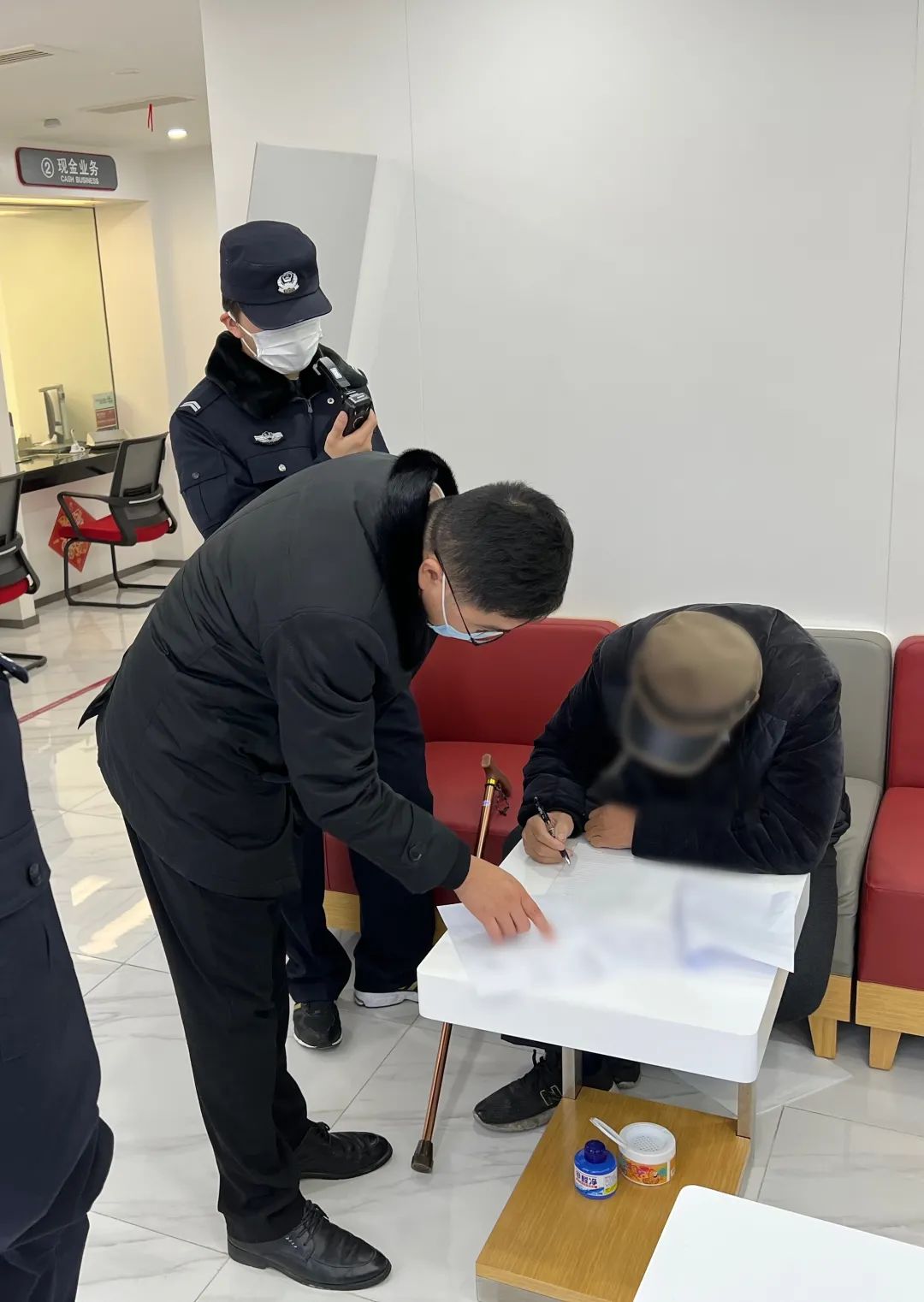 ▲协助老人在柜台办理领款