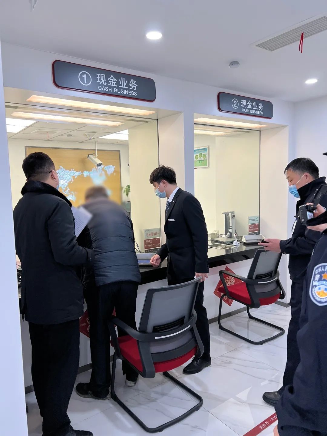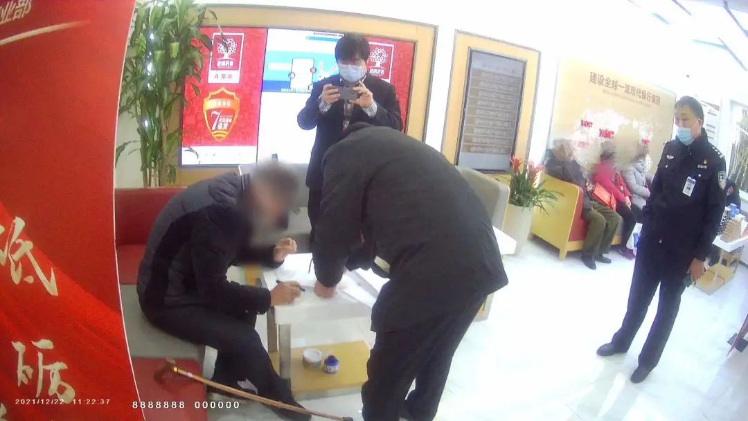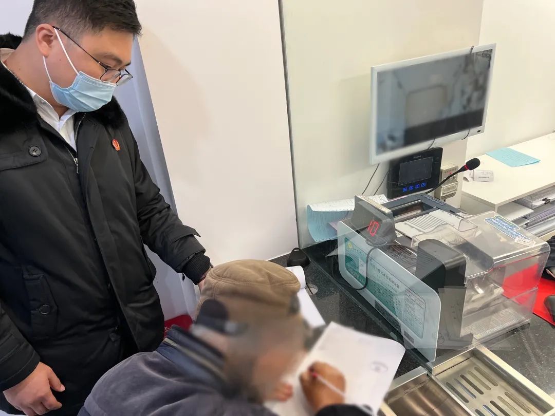 ▲协助老人填写收款信息在派出所民警的陪同下,执行局干警携带老人前往就近银行,协助其填写收款信息,成功办理领款,并将材料通过平台发往广东省茂名市电白区法院。