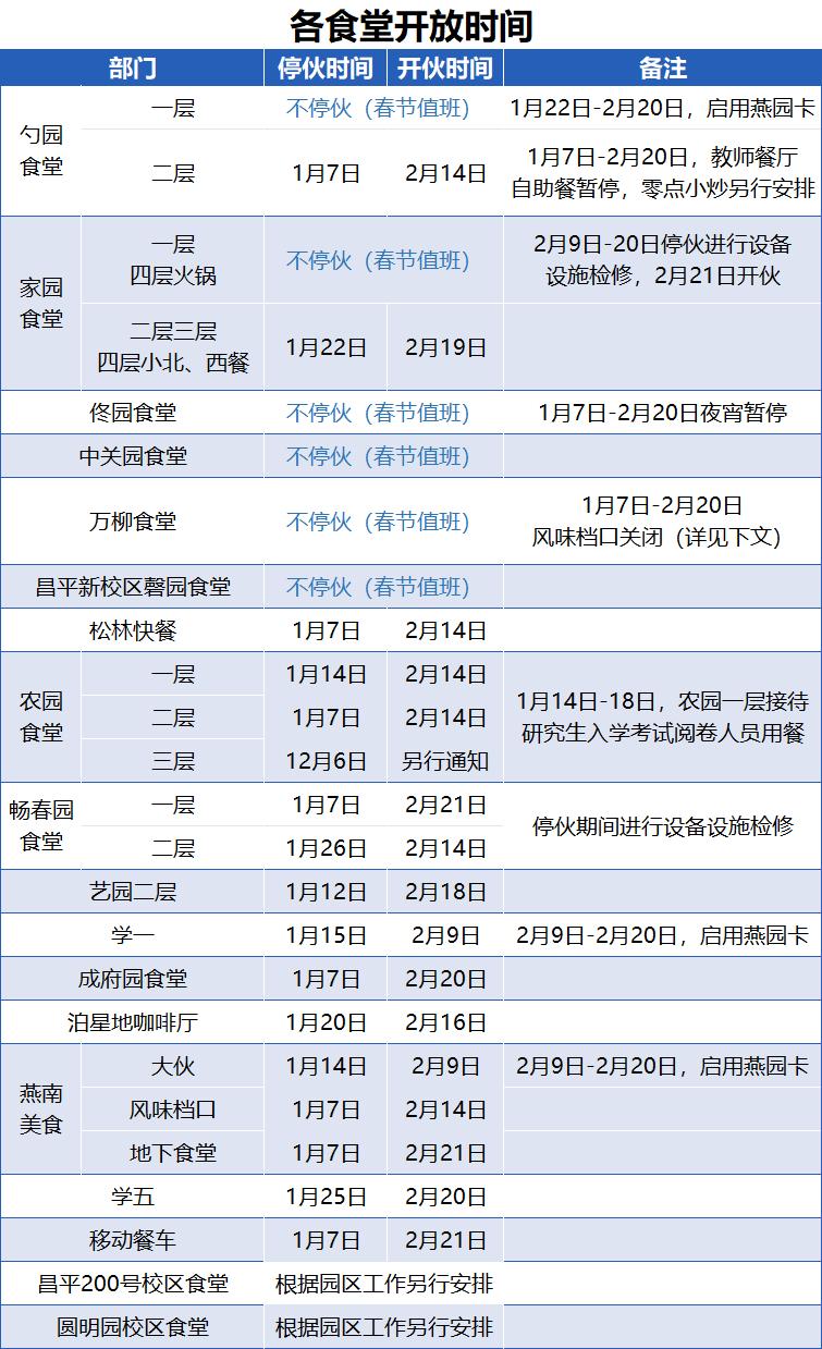 1.各食堂开放时间勺园食堂、家园食堂一层与四层火锅、佟园食堂、中关园食堂、万柳食堂、昌平新校区馨园食堂寒假不停伙且春节值班,其他食堂情况详见表格。
