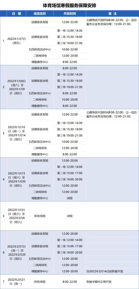体育教研部根据学校《关于调整2022年部分节假日安排的通知》要求,为保障寒假期间在校师生的体育锻炼需求,2022年1月7日(周五)至2022年2月21日(周一),体育场馆开放时间调整如下: