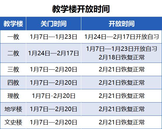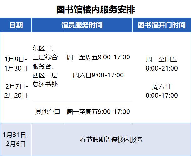 说明:1.1月8日-2月20日,图书馆只开东门和南门(1月31日-2月6日不开门)。