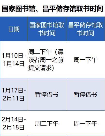 3.馆际互借和昌平储存馆取书服务时间有所调整:BALIS借书、BALIS文献传递1月17日-2月11日暂停,国家图书馆、昌平储存馆取书时间如下: