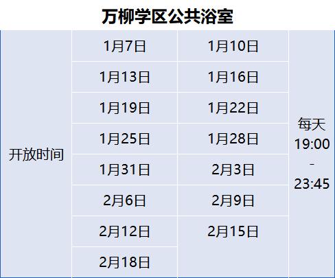 1.公共浴室自2022年1月7日至2月20日期间,每隔两天开放一次,2月21日起恢复正常,具体开放时间如下: