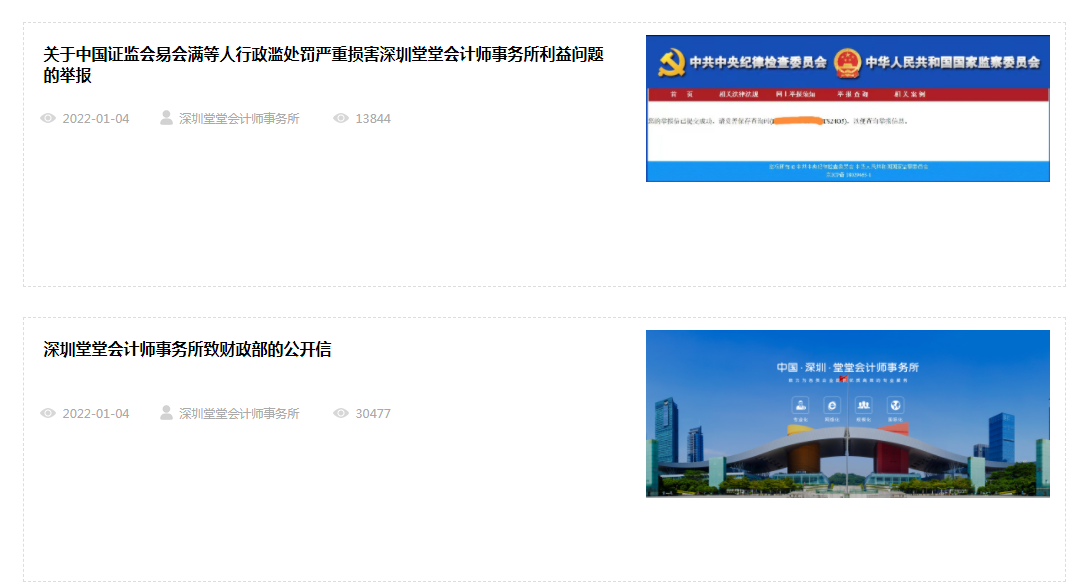 值得一提的是,1月4日,堂堂所在官网上再次发布了《深圳堂堂会计师事务所致财政部的公开信》和《关于中国证监会易会满等人行政滥处罚严重损害深圳堂堂会计师事务所利益问题的举报》。堂堂所进一步指出,通过对最近三年,即2019年至2021年的21个行政处罚及行政处理案例来看,没有一家会计师事务所被停业1年或几个月,没有一家事务所被罚款6倍。