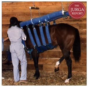 刚才说过,纤细的马腿适应奔跑。而这种美妙的线条是因为马腿下半部缺乏肌肉。这意味着,骨折后,马腿缺乏支撑和固定骨头的组织。因此,受伤的马需要特别的支撑物来保证它们可以站着养伤,这种支撑工具叫做吊马兜。